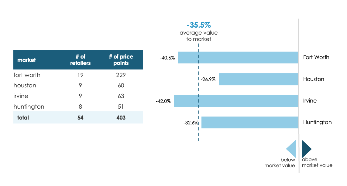 The following visuals illustrate average market prices alongside current on-site prices for Fort Worth, Houston, Irvine and the Huntington sites. This information shows where there may be an opportunity to take pricing, dependent on Alcon’s determined value goals.